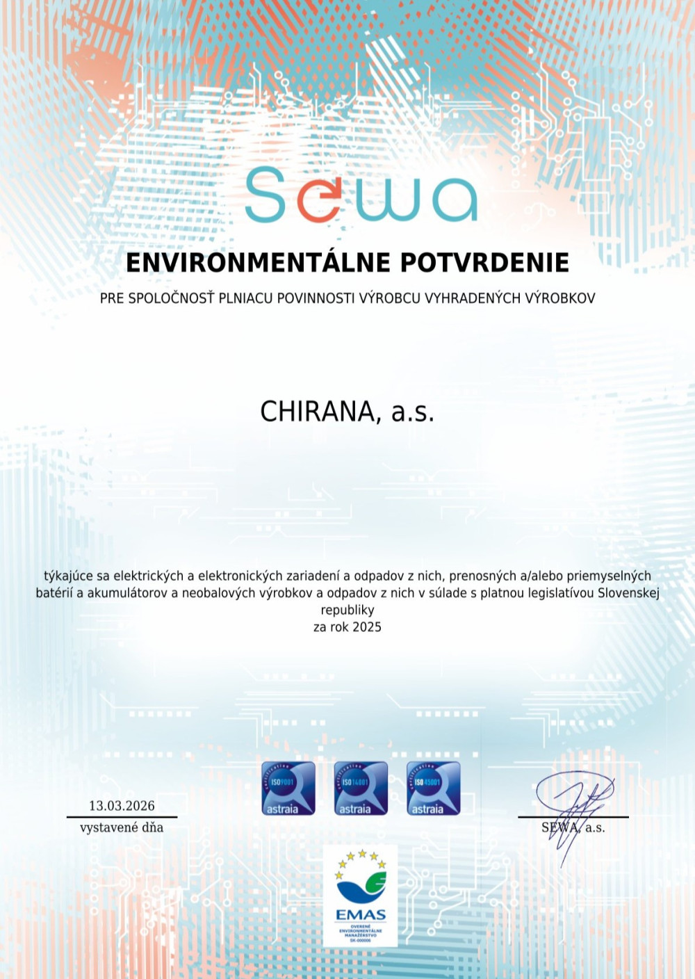 EN Chirana, a.s. - Enviromentálne potvrdenie